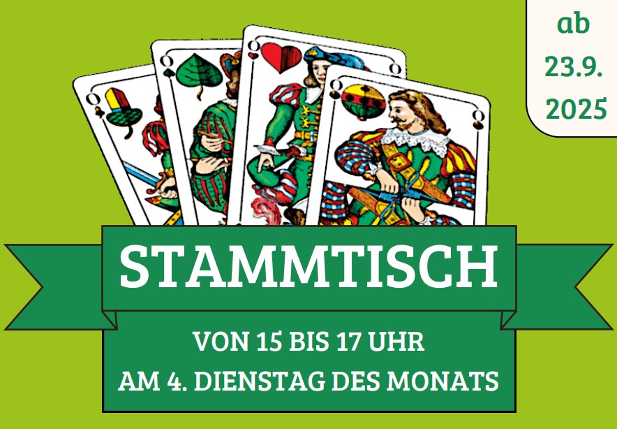 DER STAMMTISCH – dieser offene Seniorennachmittag findet jeden vierten Dienstag im Monat von 15 bis 17 Uhr im Sportheim des Sportvereins in der Würzburgerstraße 61 in Großgründlach statt.